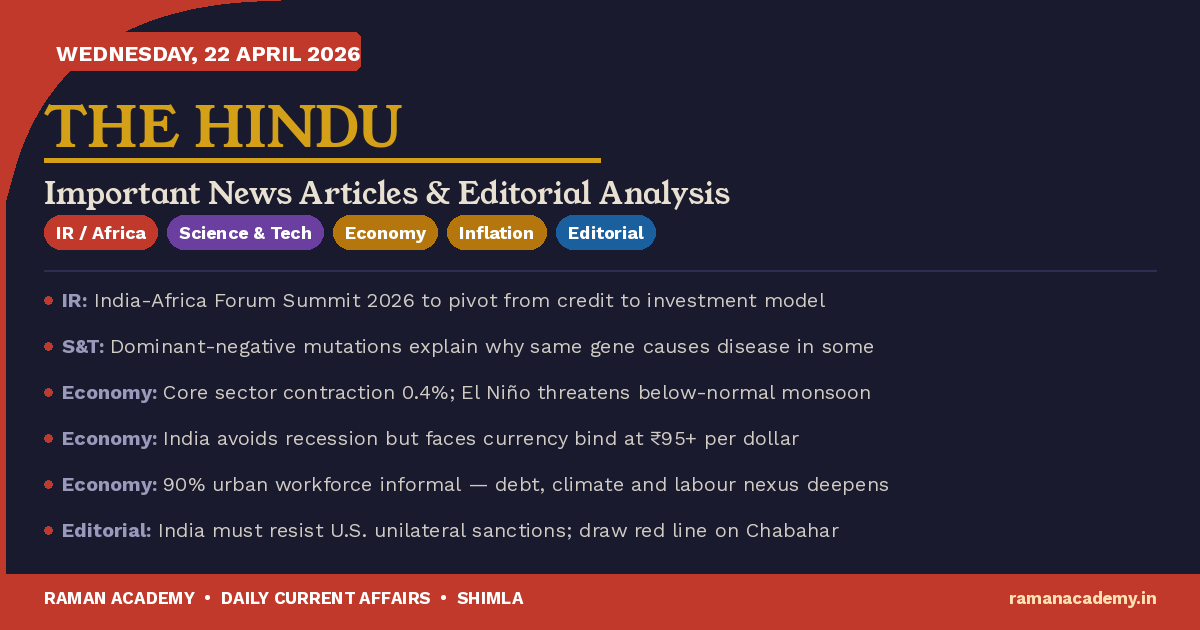1 India-Africa Summit to focus on development initiatives IR 2 Peripheral neuropathy: why only some mutations cause disease Science & Tech 3 Lustre or bluster? India's economic mettle faces headwinds Economy 4 The cost of bringing down inflation in India, U.S. and U.K. Economy 5 Challenges for India's informal urban workforce Economy 6 Editorial: India must draw a red line on U.S. unilateral sanctions Editorial